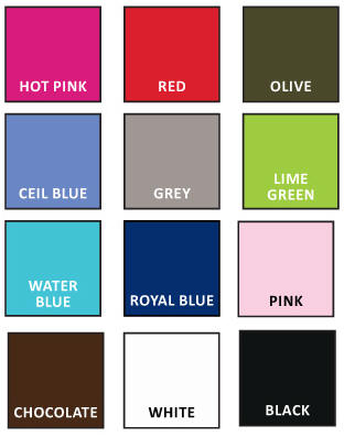 AQUA, BLACK, BURGUNDY, CEIL BLUE, CHOCOLATE, DARK NAVY BLUE, DARK ROYAL BLUE, GREY, HOT PINK, HUNTER GREEN, KHAKI, LILAC, LIME GREEN, OLIVE, ORANGE, PINK, PURPLE, RED, SURGICAL GREEN, TEAL, TRUE NAVY BLUE, TRUE ROYAL BLUE, WATER BLUE, WHITE, YELLOW